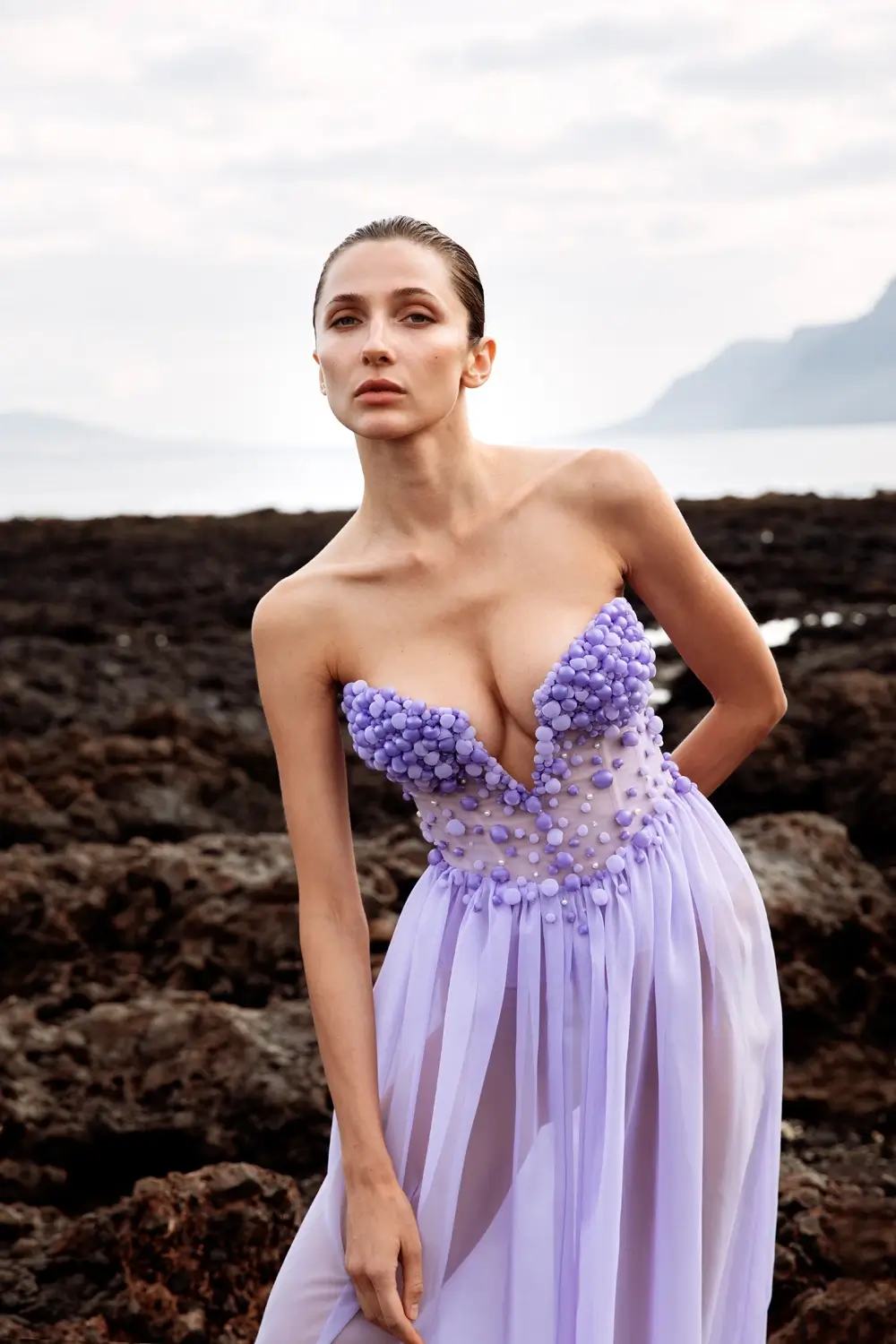 This dress features a corset design that allows for flexibility in fit, accommodating women with measurements between the above specified ranges. The structured bodice ensures a flattering silhouette while providing a comfortable and secure fit.